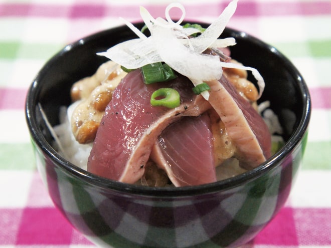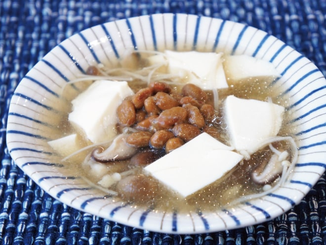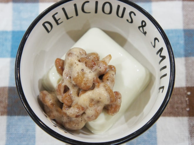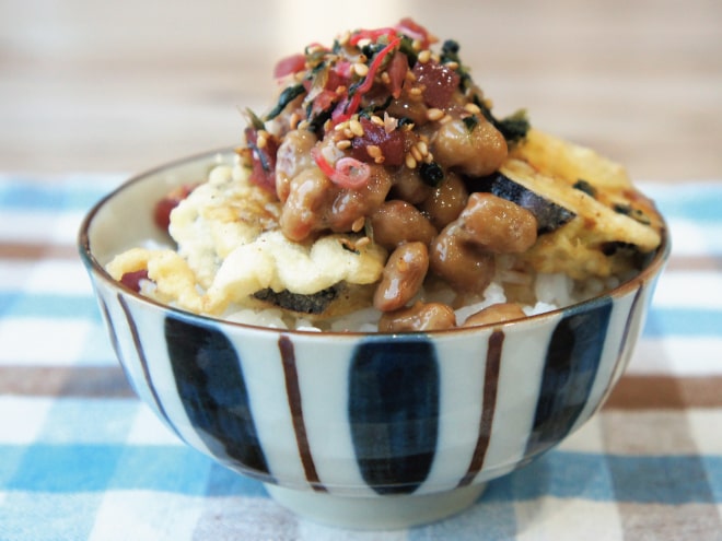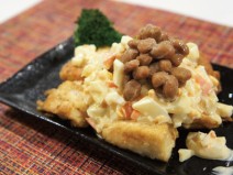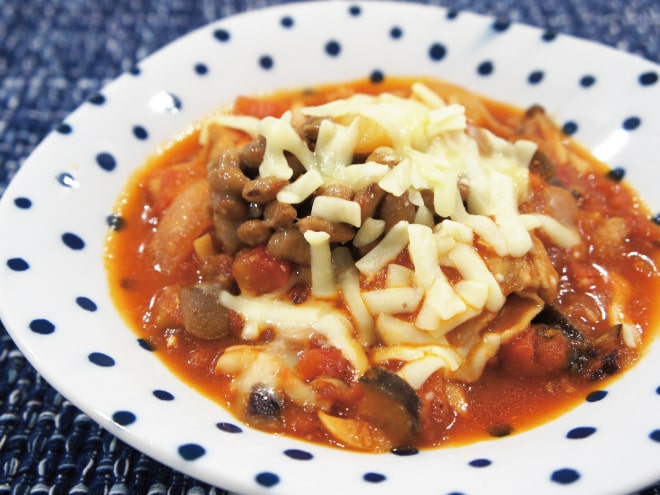 納豆(丹念納豆)、茄子、じゃがいも、しめじ、玉ねぎ、鶏もも肉、にんにく、トマト、トマトの水煮、マギーブイヨン、とろけるチーズ、粗びき塩コショウ、オリーブオイル