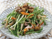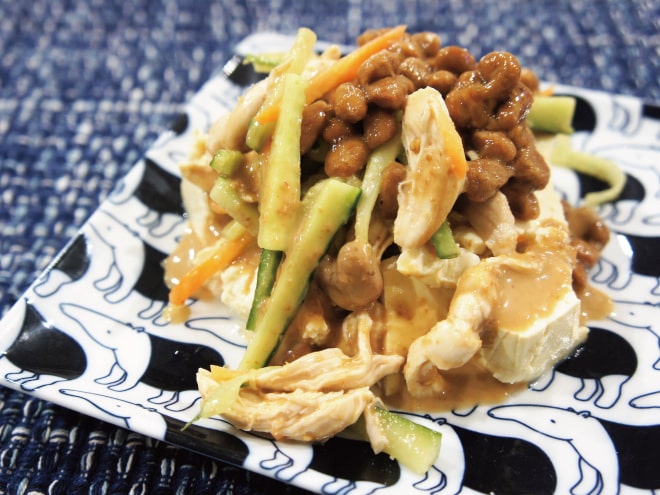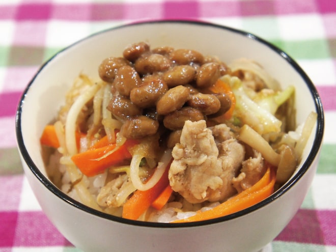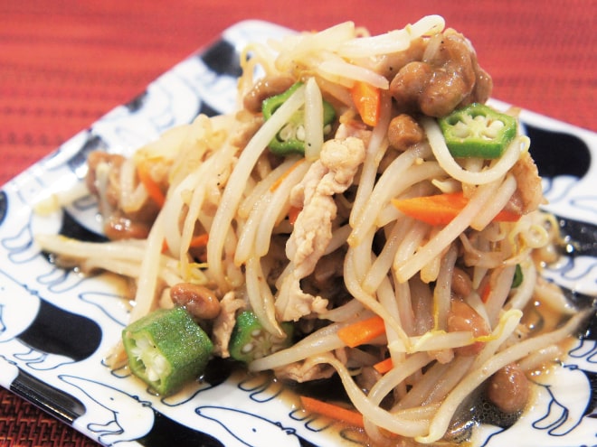 納豆(丹念納豆)、豆腐、中ネギ、スナップえんどう、合挽き肉、にんじん、味噌、甜麺醤、オイスターソース、中華あじ、醤油、ごま油、にんにくチューブ、ショウガチューブ、塩、片栗粉