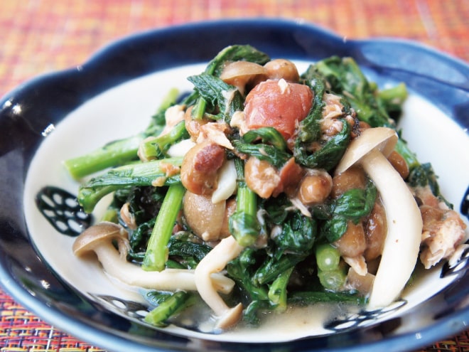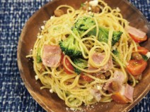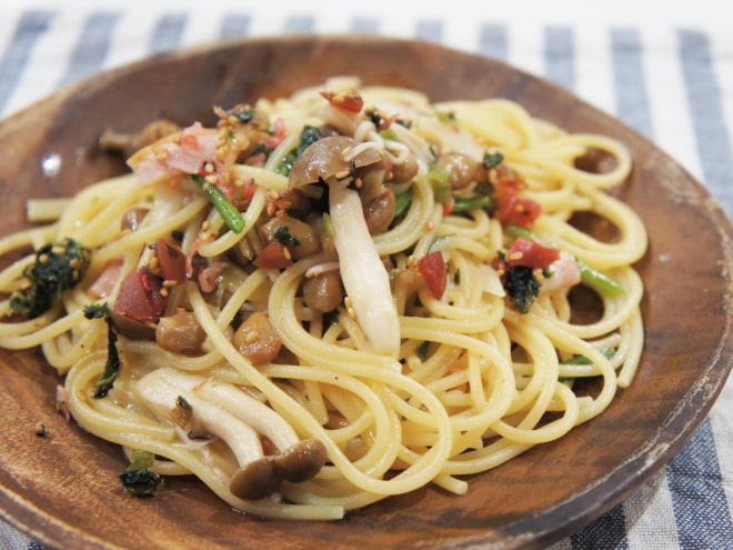 納豆(丹念納豆)、シーチキン、ベーコン、しめじ、えのき、ブロッコリー、にんにく、トマトの水煮、トマト、マギーブイヨン、オリーブオイル、粗びき塩コショウ、とろけるチーズ、パスタ麺、塩