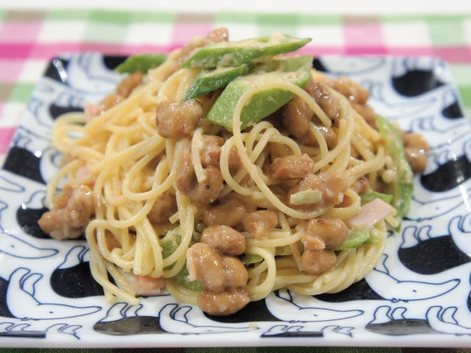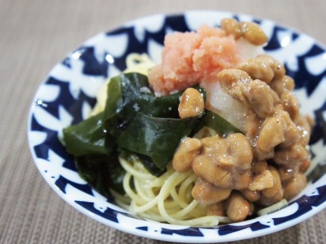 納豆(丹念納豆)、シーチキン、トマト、玉ねぎ、しめじ、にんにく、パスタ麺、コンソメ、ケチャップ、パセリ、バター、粗びき塩コショウ、塩、オリーブオイル