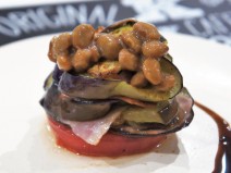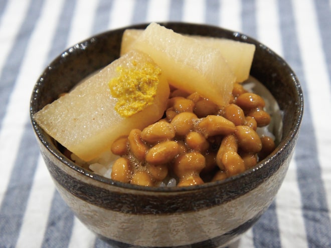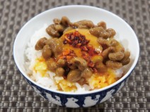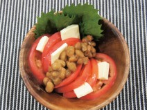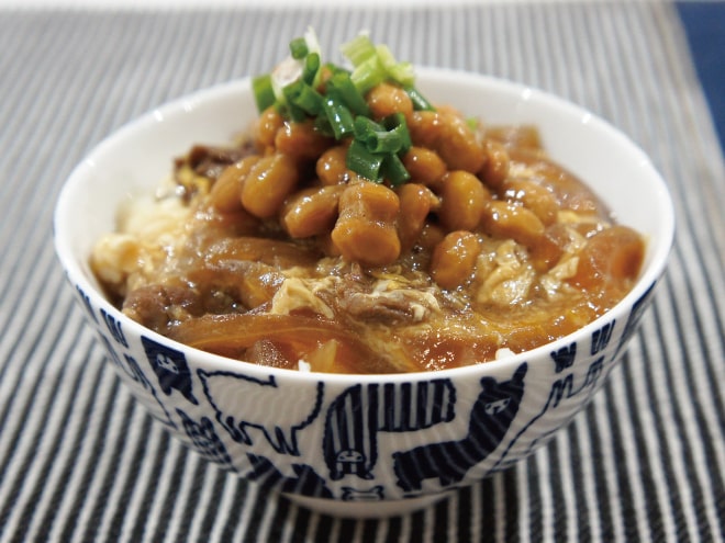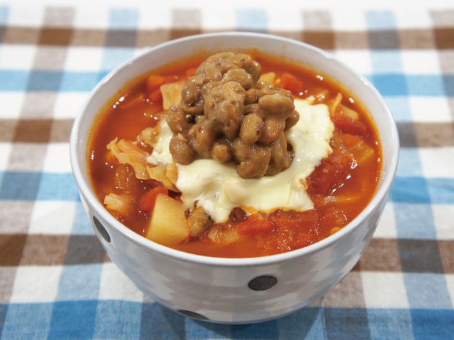 納豆(丹念納豆)、じゃがいも、玉ねぎ、にんじん、茄子、えのき、プチトマト、ニンニク、鶏もも肉、牛乳、トマトの水煮、ケチャップ、コンソメの素、塩コショウ