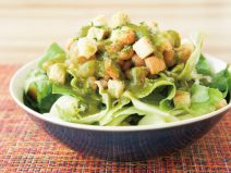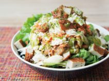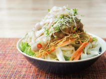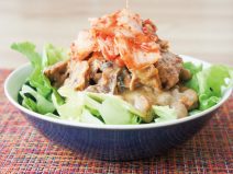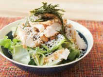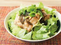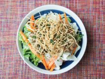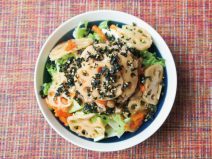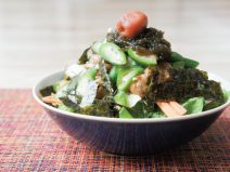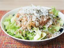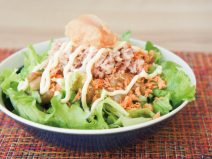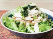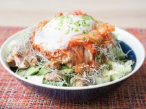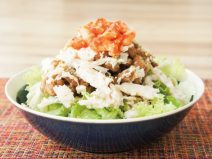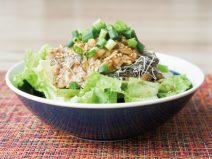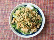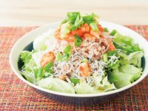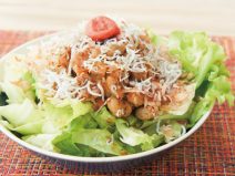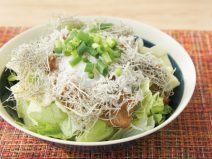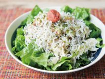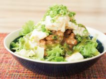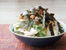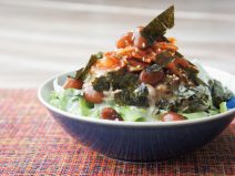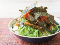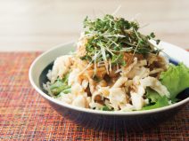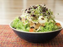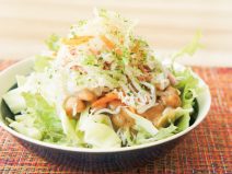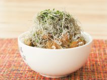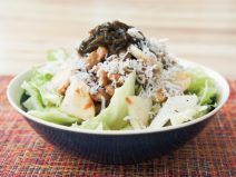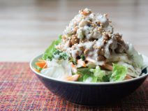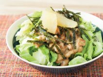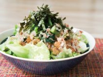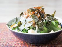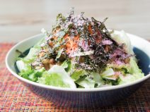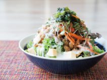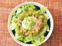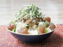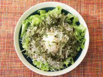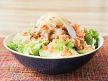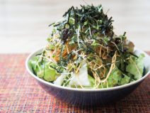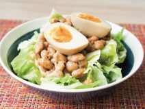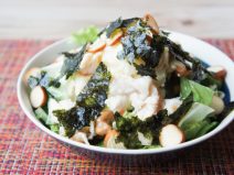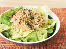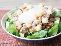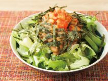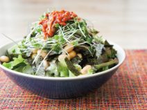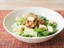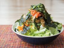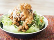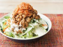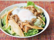 納豆(丹念納豆)、レタス、キャベツ、水菜、ブロッコリースプラウト、わさび野沢菜昆布、天かす、ごま、とろろ昆布、梅、和風醬油ごまドレッシング
