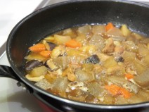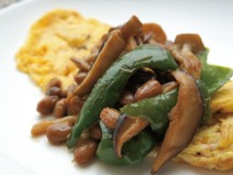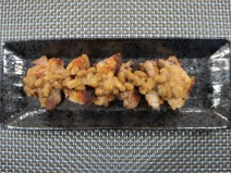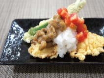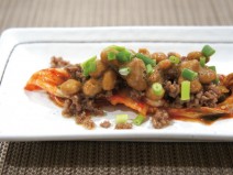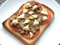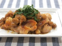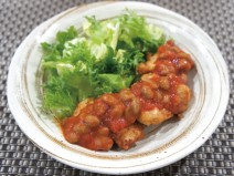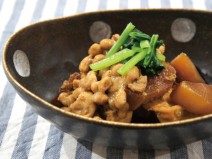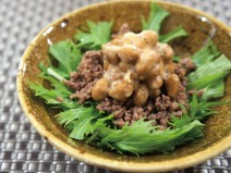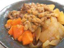 納豆(高千穂納豆)、鶏もも肉、じゃがいも、ナス、トマトの水煮、トマト、黒にんにく又はニンニク、コンソメ、しょうゆ、塩胡椒、オリーブオイル、かいわれ