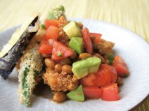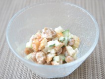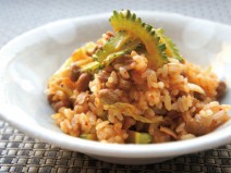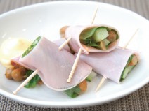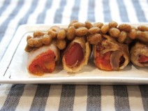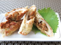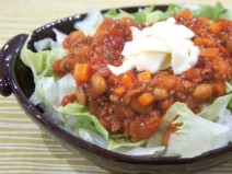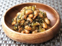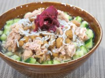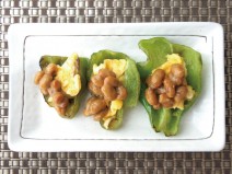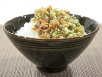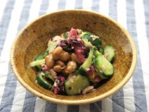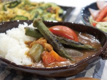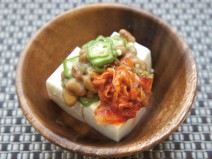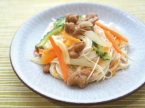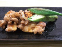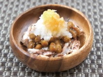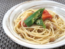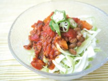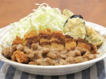 納豆(高千穂納豆)、ひき肉、ナス、玉ねぎ、人参、しいたけ、トマトの水煮、ケチャップ、塩コショウ、コンソメスープの素、だし醤油、りんごジュース、キャベツ、レタス、オクラ