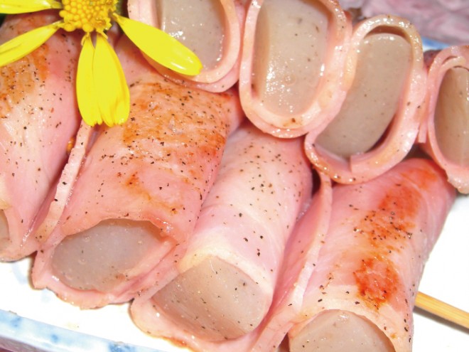 ②ベーコンで巻き、くしに刺し、軽く焼き色がついたら塩、こしょうをふります。