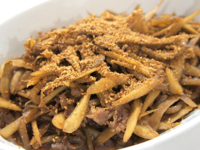 ごぼう、こんにゃく、牛バラ薄切り、しょうゆ、砂糖、酒、ごま油、すりごま