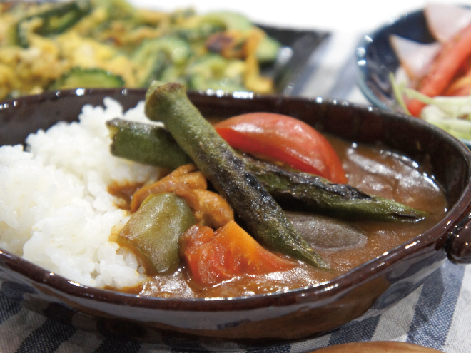 ⑥器にご飯を盛りカレーをかけて、焼いたオクラをのせたら完成です。