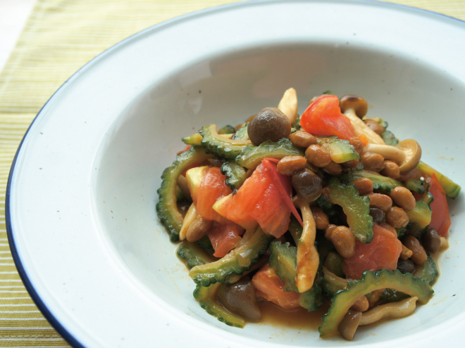 納豆(高千穂納豆)、ゴーヤ、しめじ、トマト、バター、醤油、塩コショウ
