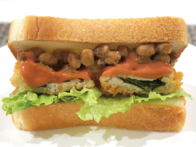 ④食パンにレタス、ささみフライ、納豆を挟み、マヨネーズとケチャップを混ぜ合わたソースをかけたら完成です。