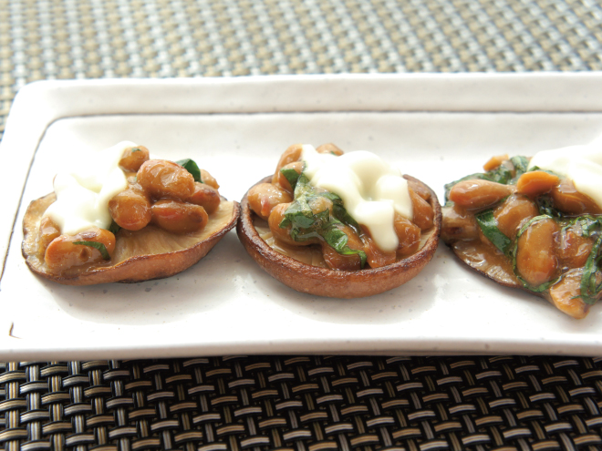 しいたけの納豆詰め 材料納豆(高千穂納豆)、しいたけ、チーズ、しそしいたけの納豆詰めの作り方①しいたけを両面焼きます。②納豆をタレと刻みしそで混ぜて、しいたけの上にのせます。③最後にチーズをかけて蒸し焼きにして完成です。
