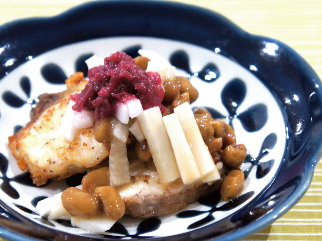 納豆(高千穂納豆)、白身魚、大根、塩コショウ、小麦粉、梅干し