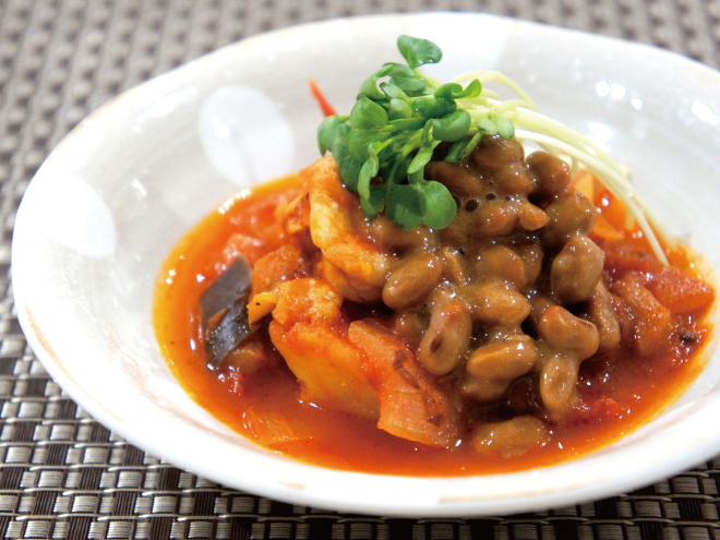 納豆(高千穂納豆)、鶏もも肉、じゃがいも、ナス、トマトの水煮、トマト、黒にんにく又はニンニク、コンソメ、しょうゆ、塩胡椒、オリーブオイル、かいわれ