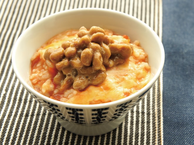 ②チーズがとろけたら、お茶碗に盛り付け、納豆をかけたら完成です。