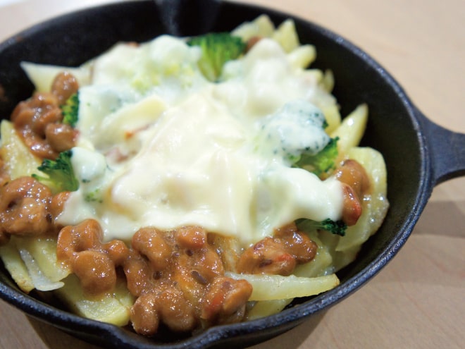 ③スキレットで①を十分焼いたら、茹でたブロッコリーを入れ納豆、チーズをかけます。