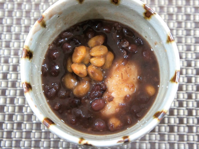 ①ぜんざいを作り、その中にもちをいれて煮込みます。