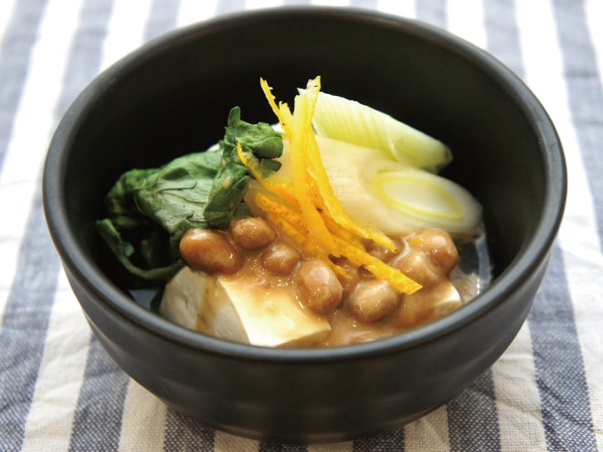 ④お椀に豆腐、長ネギ、春菊を盛り付けたら③の納豆タレをかけてゆず皮をそえたら完成です。