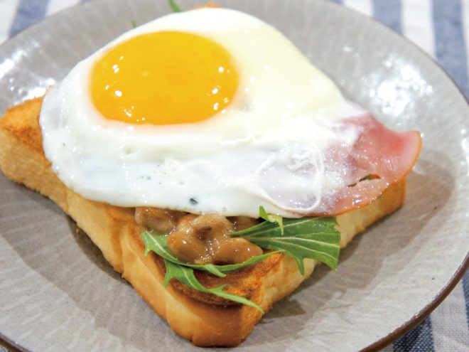 ハムエッグ納豆トースト 材料納豆(丹念納豆)、卵、ハム、水菜、食パンハムエッグ納豆トーストの作り方①食パンを焼きます。②フライパンでハムを焼き、卵を入れて焼きます。③トーストに、水菜、納豆、ハムエッグをのせたら完成です。