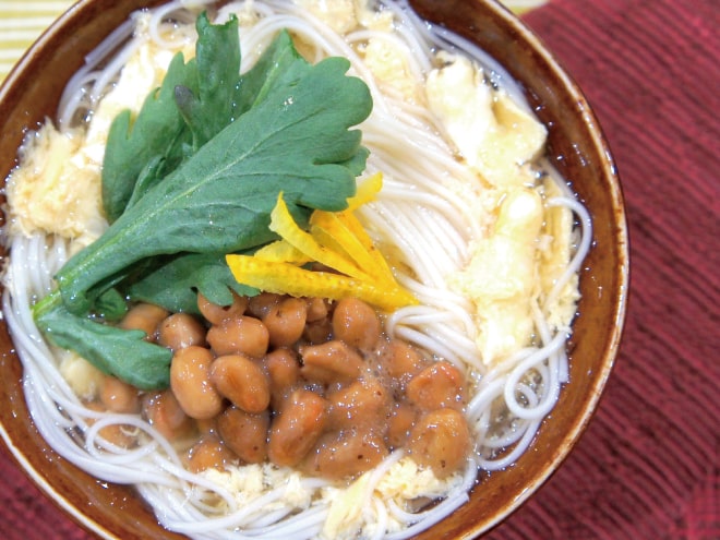 納豆(高千穂納豆)、素麺、卵、だし醤油、濃口醤油、片栗粉、春菊、ゆず皮