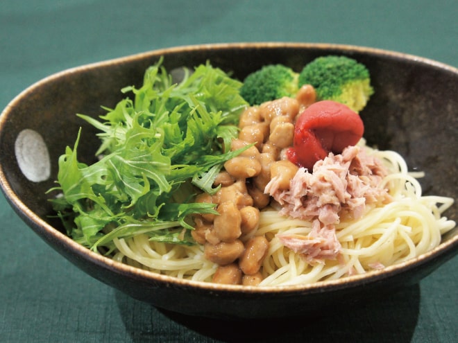 納豆と梅のさっぱりサラスパ|納豆を使用した簡単料理、レシピ・作り方を紹介