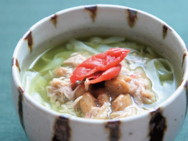 納豆(丹念納豆)、シーチキン、梅、豆乳こんにゃく麺、抹茶