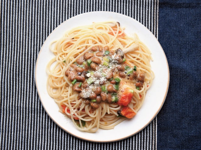 納豆(丹念納豆)、卵、明太子、ネギ、ピーマン、しめじ、ニンニク、パスタ麺、だし醤油、塩、オリーブオイル