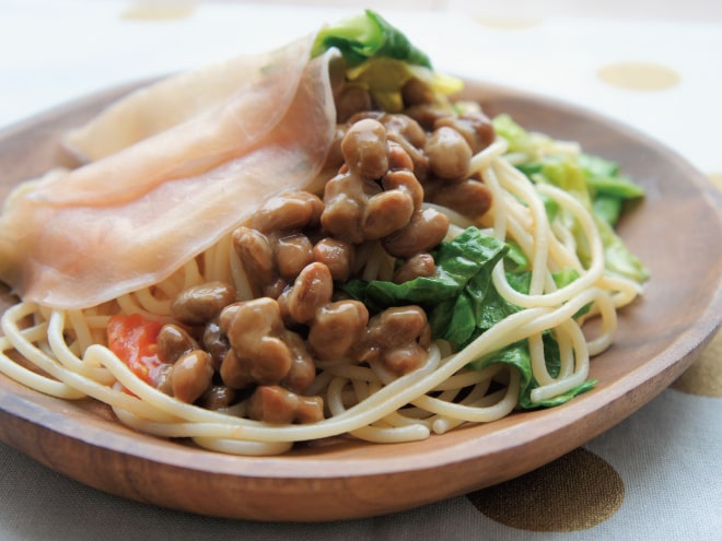 納豆(丹念納豆)、トマト、キャベツ、アンチョビ、ニンニク、パスタ麺、生ハム、醤油、塩、粗挽き塩コショウ、オリーブオイル