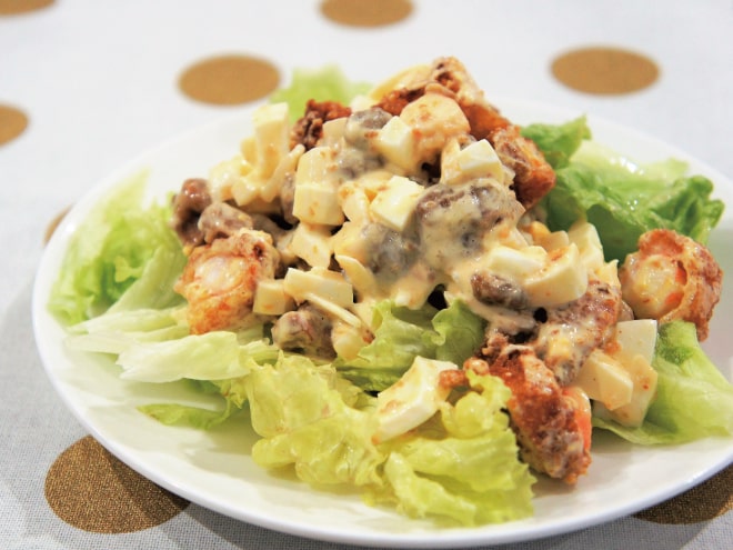 ③揚げおわったら、切って①と混ぜ合わせ、レタスと一緒に盛り付けたら完成です。