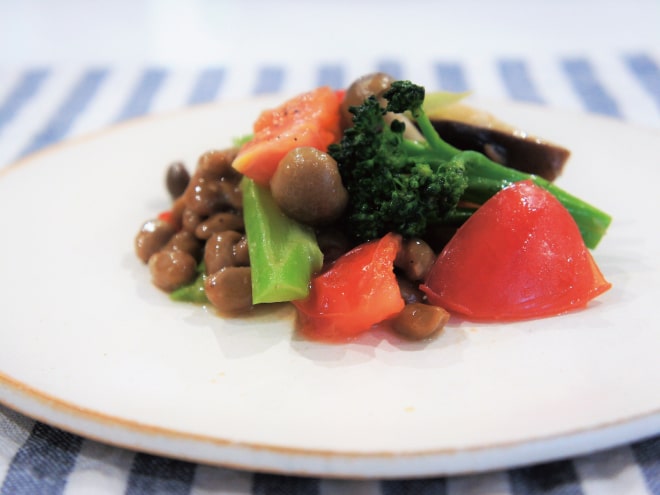 納豆(丹念納豆)、トマト、ブロッコリー、しいたけ、しめじ、アンチョビ、オリーブオイル、あらびき塩胡椒