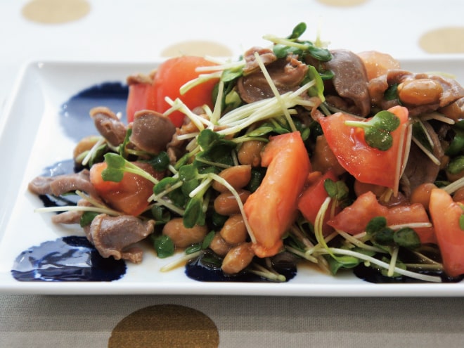 納豆(丹念納豆)、トマト、カイワレ大根、砂肝、醤油、胡麻油、酢、砂糖