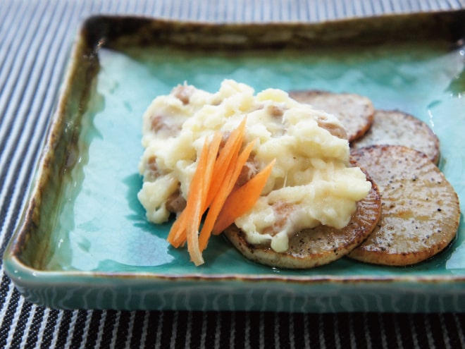 ⑤大根を器に並べ、④の納豆マッシュポテトをかけ、薄切りにした人参を添えたら完成です。