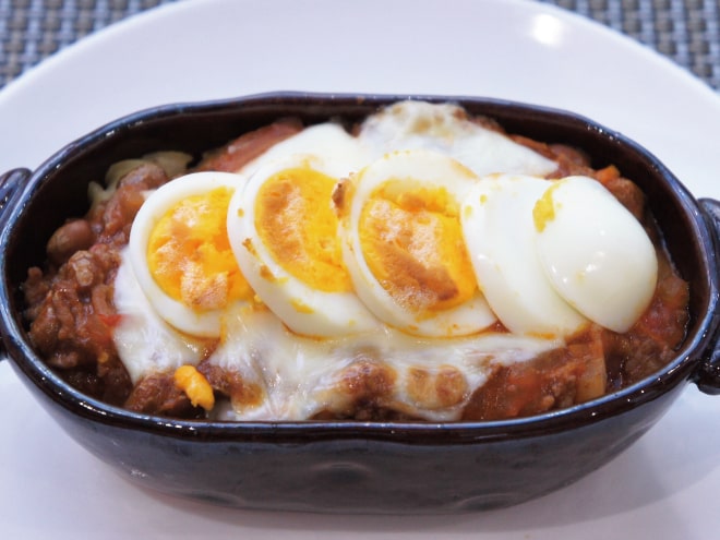 ⑤それぞれ完成したソースを耐熱皿へ入れます。まずクリームソースを半分入れ、次にミートソースを入れとろけるチーズ、茹で卵をのせオーブンで焼き目をつけたら完成です。