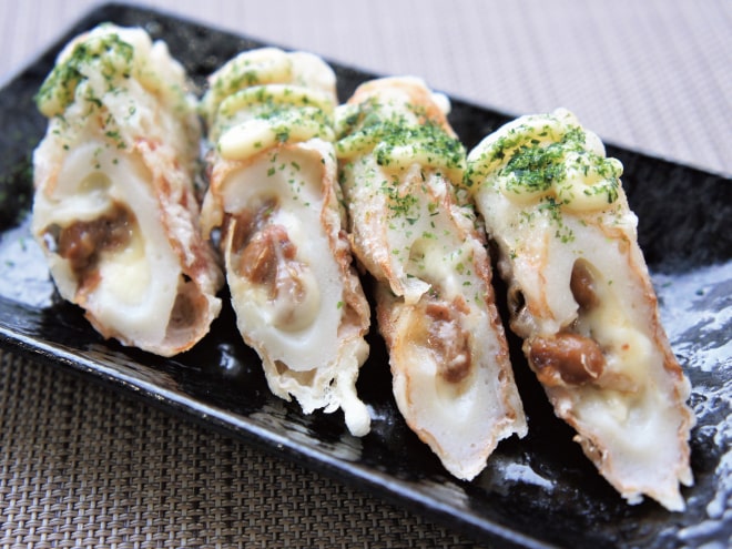④梅の塩気があるのでそのままでも充分ですが、上からお好みでマヨネーズ、青のりをかけたら完成です。