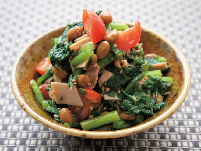 納豆(丹念納豆)、春菊、ミニトマト、シーチキン、ハム、ごま、ポン酢、、ごま油