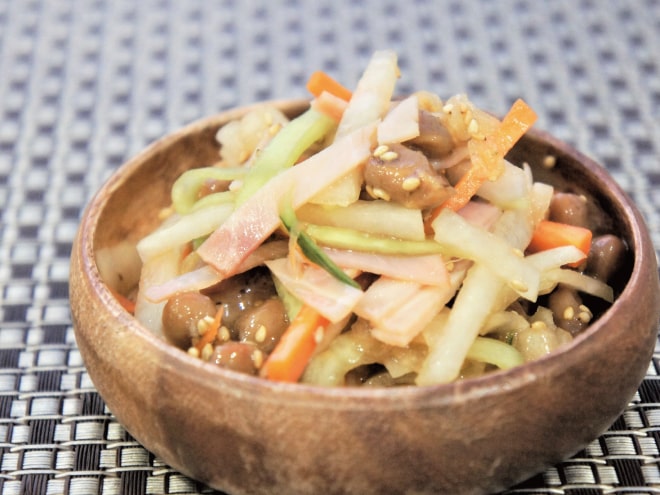 納豆(丹念納豆)、大根、にんじん、きゅうり、ハム、ポン酢、砂糖、ごま油、ゴマ