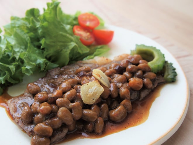 納豆(丹念納豆)、牛ロースステーキ肉、市販のステーキのタレ、粗挽き塩コショウ、にんにく