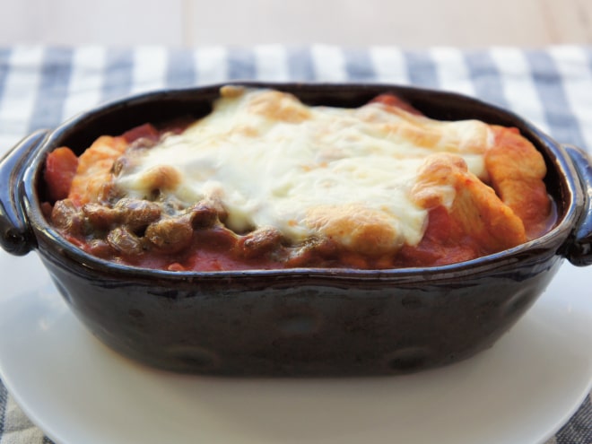 納豆(丹念納豆)、鶏胸肉、なす、じゃがいも、ニンニク、小麦粉、トマトの水煮、コンソメ、だし醤油、塩コショウ、チーズ