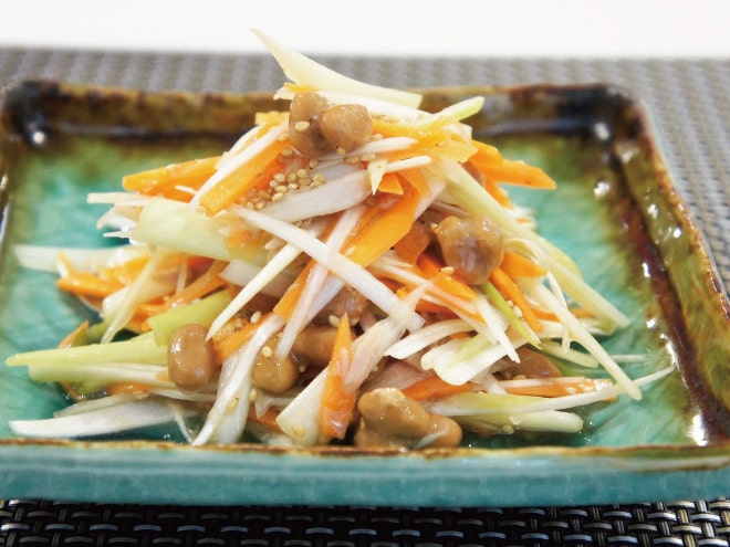 納豆(丹念納豆)、白ネギ、にんじん、ごま、だし醤油、ごま油、酢