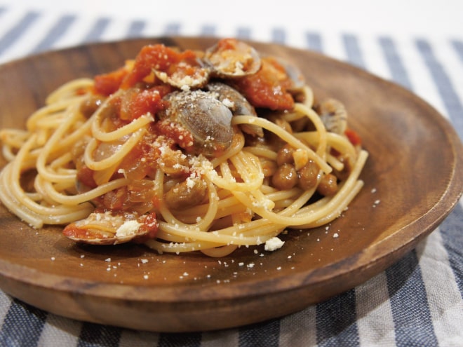納豆(丹念納豆)、アサリ、たまねぎ、トマトの水煮、トマト、ニンニク、コンソメ、塩、パスタ麺、白ワイン又は酒、オリーブオイル