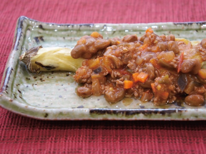 納豆(丹念納豆)、合い挽肉、玉ねぎ、にんじん、ナス、トマト、ピーマン、ニンニク、コンソメ、ケチャップ、塩コショウ、薄口しょうゆ、砂糖
