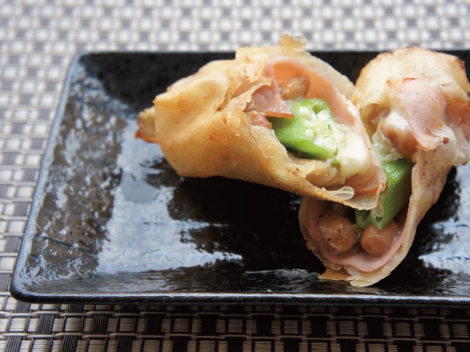 納豆(丹念納豆)、ハム、オクラ、チーズ、小麦粉、春巻きの皮