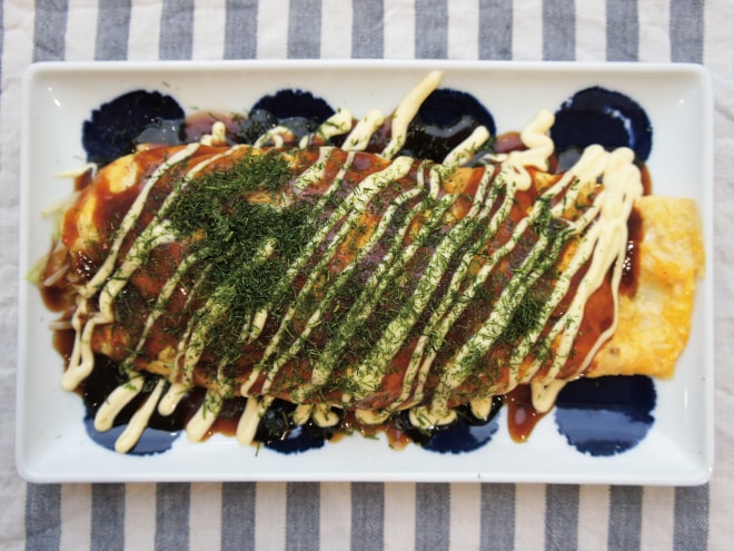 ④仕上げに、お好み焼きソース、マヨネーズ、青のりをかけたら完成です。