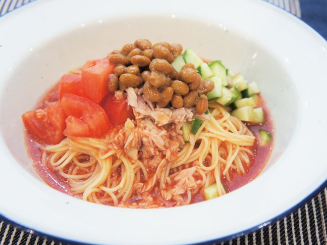 納豆(丹念納豆)、サラダパスタ麺、シーチキン、トマト、きゅうり、トマトジュース、コンソメ、塩、オリーブオイル