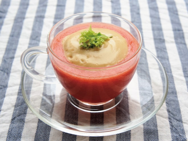 ②カップにすいかを注いで、次に納豆を注ぎ、最後に塩をかけたら完成です。