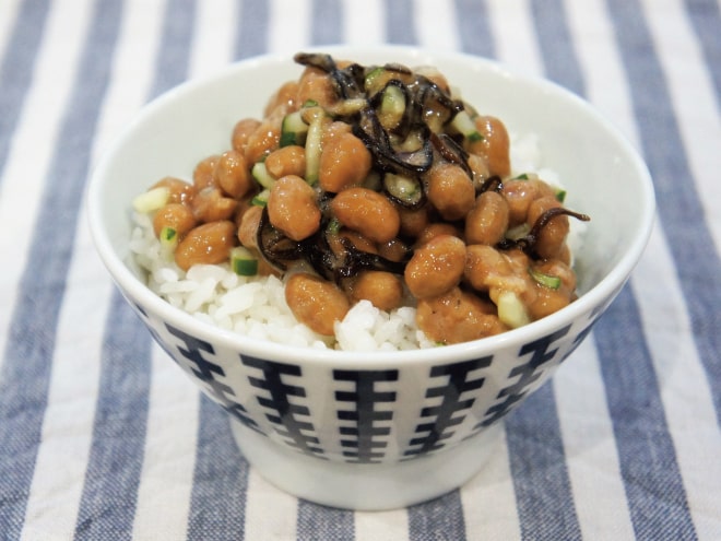 納豆(丹念納豆)、塩昆布、きゅうり、ご飯