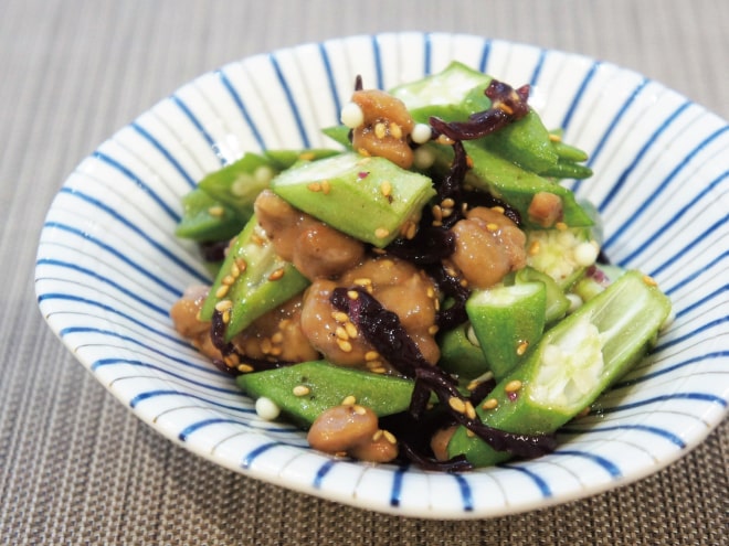 納豆(丹念納豆)、オクラ、しば漬けきくらげ