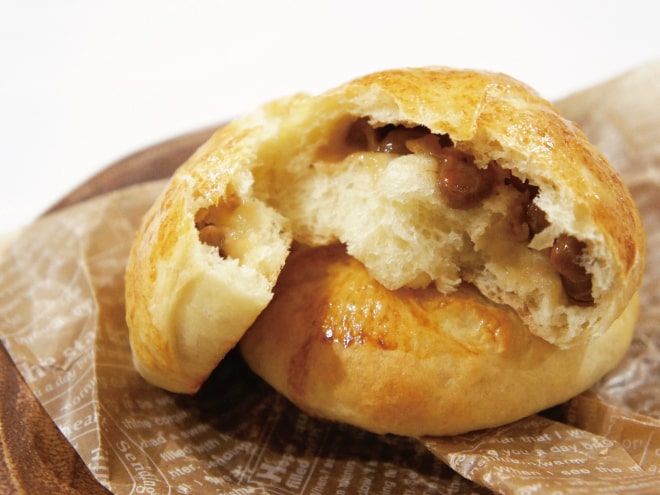 納豆(丹念納豆)、強力粉300g、ドライイースト6g、砂糖40g、食塩5g、卵2分の1個強、ぬるま湯175cc、無塩バター45g