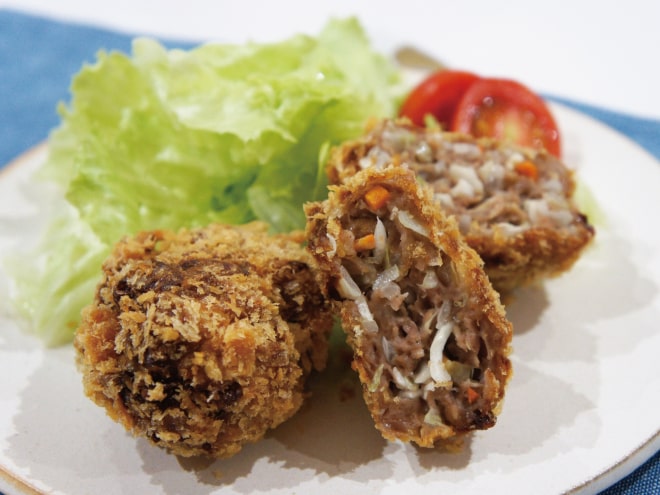 ④ボールに小麦粉と水を入れて混ぜたら、③の形成したものをつけ、次にパン粉をまとわせて油で揚げていきます。