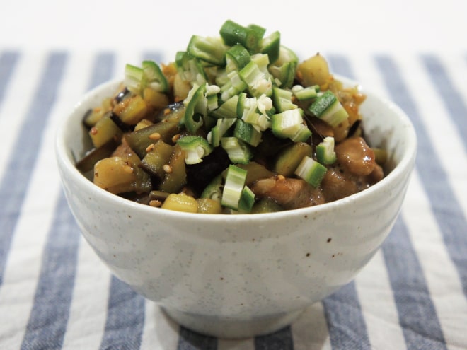 ナスのごま油炒めオクラ納豆かけご飯の作り方