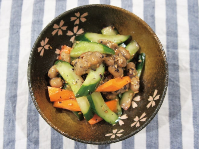 納豆(丹念納豆)、きゅうり、にんじん、ゆかり、塩