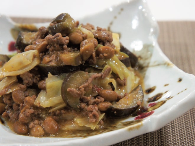 納豆(丹念納豆)、茄子、キャベツ、合挽き肉、味噌、醤油、ウェイパー、酒、みりん、豆板醤、片栗粉